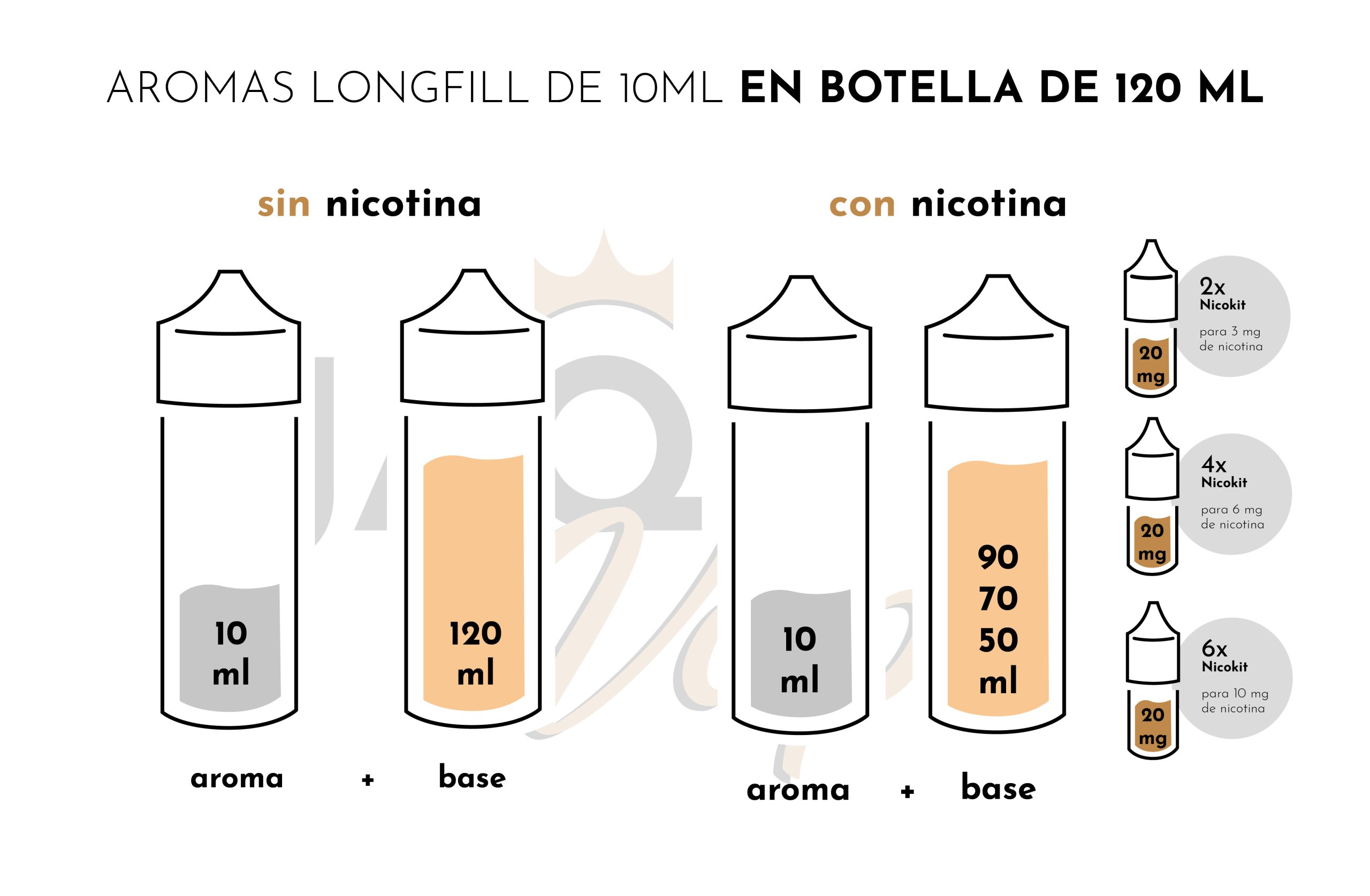 Es un aroma súper concentrado diseñado para una proporción final 50PG/50VG, por lo tanto se debe añadir, solo VG, ya sea en formato base o nicokit.