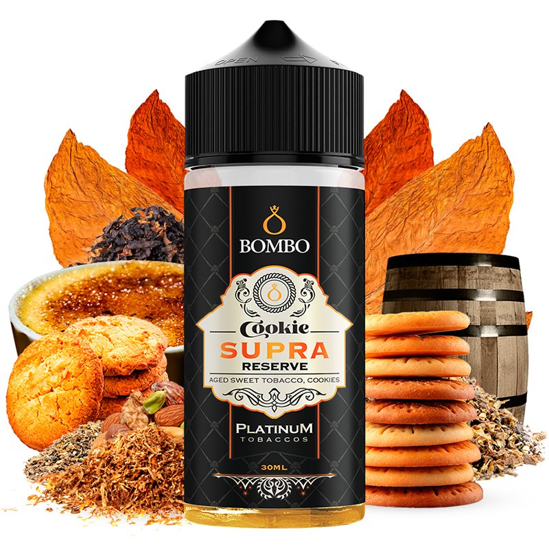 El aroma Cookie Supra Reserve en formato Longfill de Platinum Tobaccos by Bombo es una variación de Supra (Mejor Tabaquil en Dubai 2023 y Vapexpo 2022), famoso por su exquisito sabor a tabaco dulce con matices acaramelados y tostados; ahora combinado con tiernas galletas artesanas.