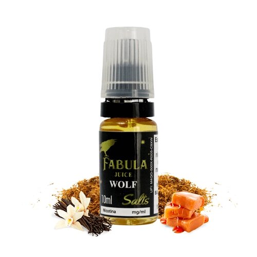 Fabula Juice Salts Wolf. Una mezcla de tabacos suave y equilibrada con el aporte justo de dulzor del caramelo y la vainilla. Potente y audaz como el lobo, combina lo mejor de sí mismo para ser el líder.