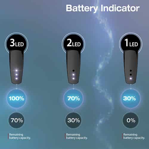 - Las tres luces encendidas simultáneamente significan que la batería se encuentra entre el 100 y el 70%.
