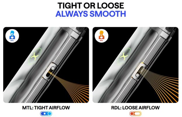 A través de una pestaña lateral, este dispositivo permite configurar la entrada de aire, permitiendo configurar un modo de vapeo MTL o RDL.