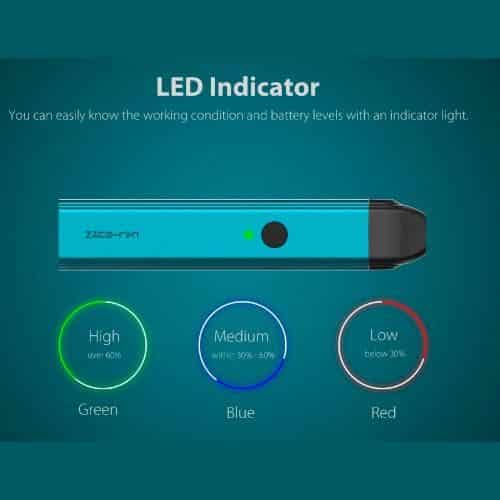 - El indicador led tiene 3 posibles colores, el color verde nos indica una batería por encima del 70%, una luz azul batería entre el 30% y 70% y la luz roja batería por debajo del 30%. Cuando la luz sea roja notaremos pérdida de potencia y será un buen momento para cargarlo. Se puede utilizar mientras se carga.